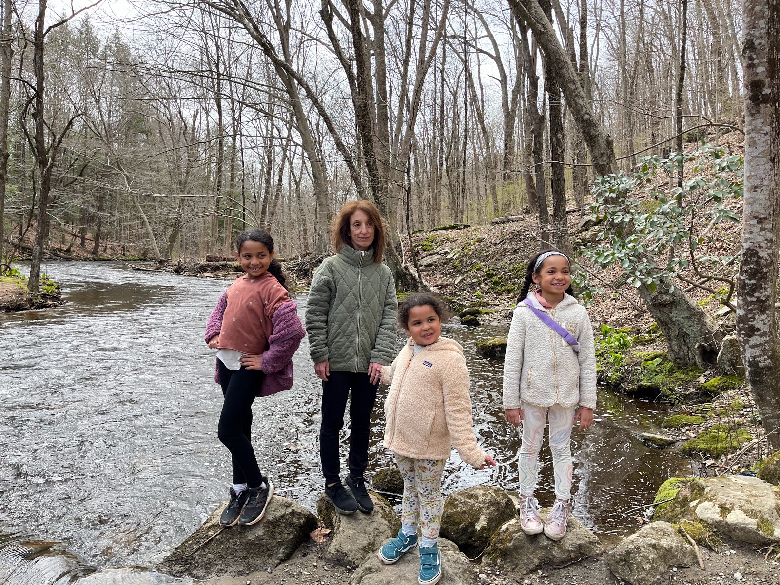 It was a warmer day today. My family planned to go on a hike with my Mimi and Poppy. We drove to a new place nearby. When we got out of the car, we started to walk on the trail. While we were walking, we saw a river. We went off the trail to get a closer look at the river. We took a picture next to it. We also climbed some rocks. When we finished by the river, we climbed back up the hill and continued our hike. After about two miles of walking, it started to get tiring. We decided to turn back around because we had to go back two more miles to get to the car. "Are we almost to the finish line?" my sister Rose kept asking. I couldn't wait to get back to the car. There were benches along the path. We stopped to take a little break. After some more walking, we finally got to the parking lot. I was so happy to be able to sit.